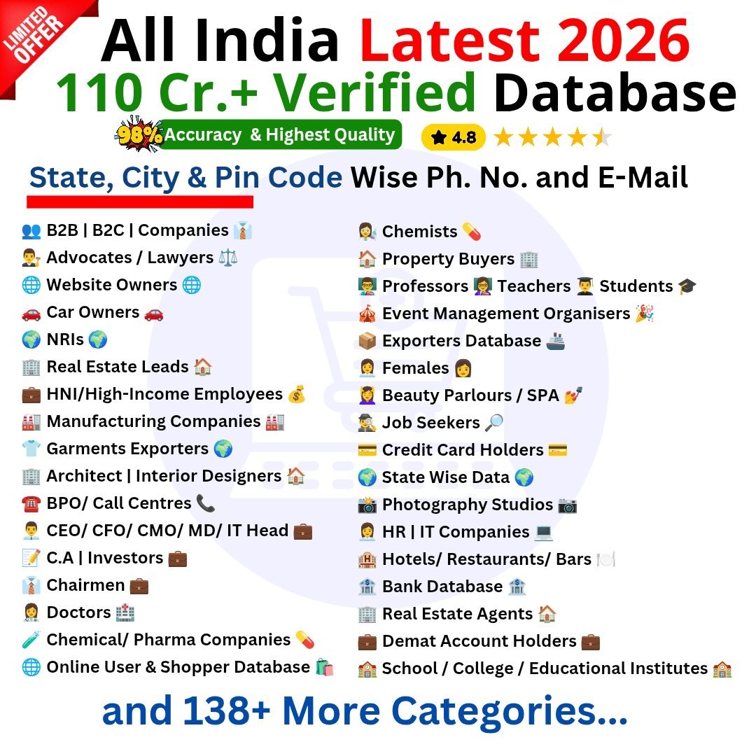 Unlock the power of comprehensive, updated, and verified data with our All India Latest Database, covering 138+ categories across various industries, professionals, and businesses. Whether you are in marketing, lead generation, business expansion, or research, this highly curated database ensures maximum reach and accuracy for your business growth.